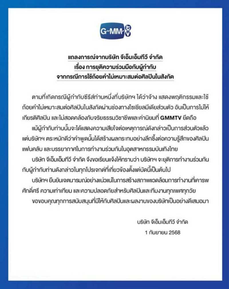 ทางบริษัทฯ ระบุว่า การตัดสินใจยุติการทำงานร่วมกับผู้กำกับรายนี้ เป็นการรักษามาตรฐานการทำงาน และจริยธรรมของ GMMTV พร้อมทั้งย้ำว่า ในอนาคตจะไม่ยอมรับการกระทำที่ขัดกับค่านิยม และหลักการเหล่านี้