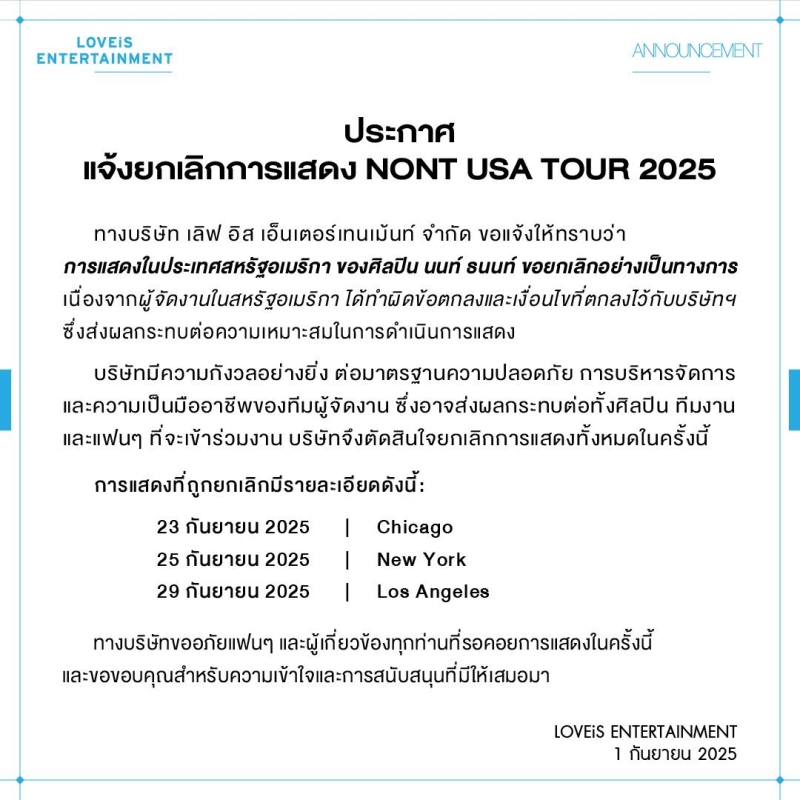 เมื่อวันที่ 1 ก.ย. 68 ทางเพจ LOVEiS ได้มีการโพสต์หนังสือประกาศแจ้งยกเลิกการแสดง NONT USA TOUR 2025 มีเนื้อหาระบุว่า.. "ประกาศแจ้งยกเลิกการแสดง NONT USA TOUR 2025 ทางบริษัท เลิฟ อิส เอ็นเตอร์เทนเม้นท์ จำกัด ขอแจ้งให้ทราบว่า การแสดงในประเทศสหรัฐอเมริกา ของศิลปิน นนท์ ธนนท์ ขอยกเลิกอย่างเป็นทางการ เนื่องจากผู้จัดงานในสหรัฐอเมริกา ได้ทำผิดข้อตกลงและเงื่อนไขที่ตกลงไว้กับทางบริษัทฯ ซึ่งได้รับผลกระทบต่อความเหมาะสมในการดำเนินการแสดง