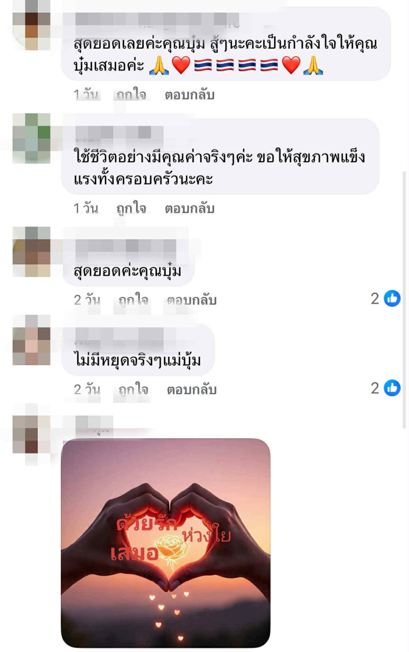 โพสต์ดังกล่าวสร้างความประทับใจ และได้รับการชื่นชมจากทั้งคนในวงการบันเทิง และแฟนคลับ ที่ต่างยกย่องความมุ่งมั่น และจิตอาสาของ บุ๋ม