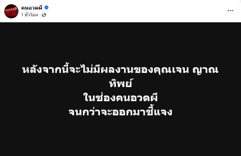 ล่าสุดทางด้านเพจของรายการคนอวดผีคนอวดผี ได้ออกมาโพสต์เคลื่อนไหวว่า หลังจากนี้จะไม่มีผลงานของคุณเจน ญาณทิพย์ ในช่องคนอวดผี จนกว่าจะออกมาชี้แจง