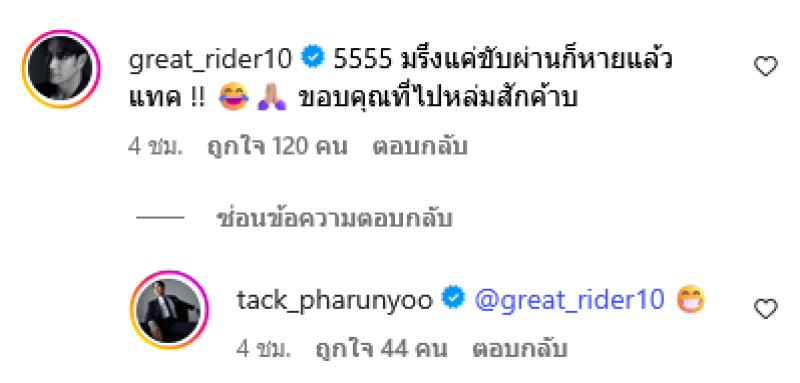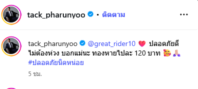 ล่าสุดนักแสดงสายจิตอาสา แทค ภรัณยู ได้โพสต์ภาพหน้าร้านทองของเเม่เกรท พร้อมอัปเดตสถานการณ์ว่า ปลอดภัยดีไม่ต้องห่วง บอกแม่นะ ทองหายไปละ120 บาท#ปลอดภัยนิดหน่อย โดย เกรท ได้เข้าไปตอบกลับกลับอย่างฮาว่า 5555 มรึงแค่ขับผ่านก็หายแล้วแทค!! ขอบคุณที่ไปหล่มสักค้าบ