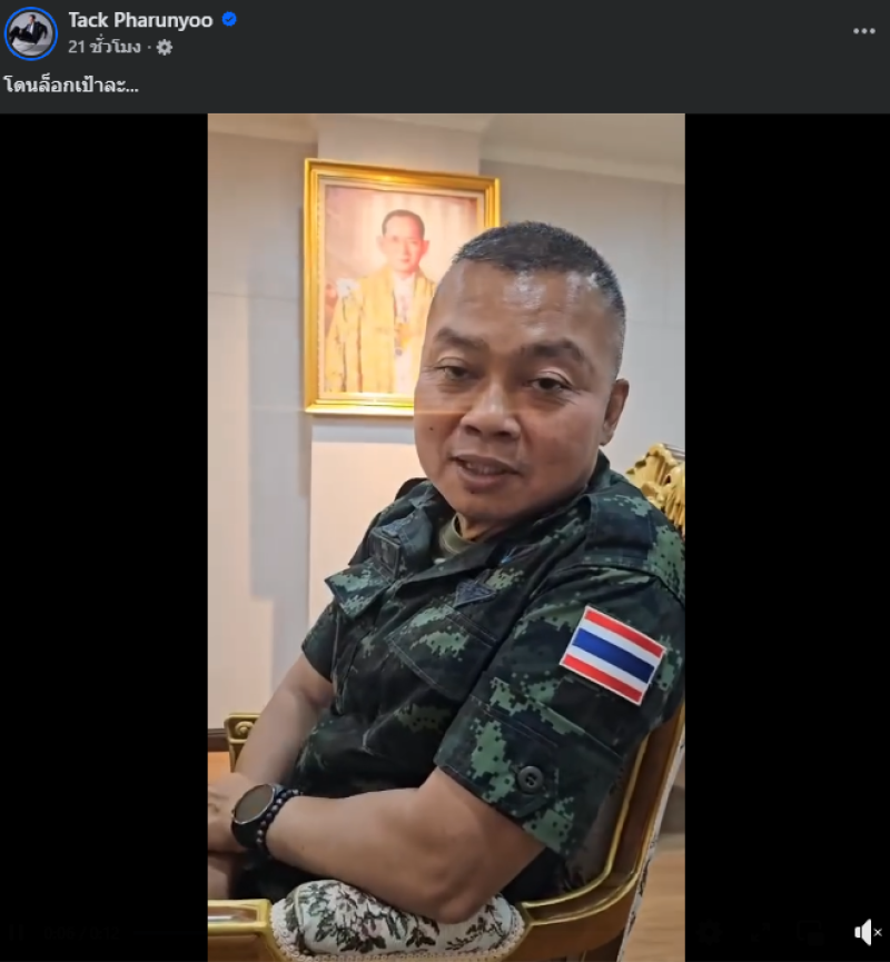 ล่าสุดแทคได้โพสต์คลิปวิดีโอจาก พล.ท.บุญสิน พาดกลาง หรือ แม่ทัพกุ้ง แม่ทัพภาคที่ 2 ผ่านเฟซบุ๊กส่วนตัว Tack Pharunyoo ที่ส่งข้อความตรงมาถึงเจ้าตัว โดยกล่าวว่า