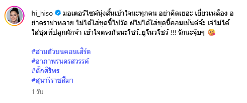ขณะร้องเพลง มอเตอร์ไซค์นุ่งสั้น พร้อมทั้งเต้นอยู่ในคอนเสิร์ตกับ ฮาย อาภาพร และ ตั๊ก ศิริพร พร้อมแคปชั่นว่า มอเตอร์ไซค์นุ่งสั้นเข้าใจนะทุกคน อย่าคิดเยอะ เยี่ยวเหลือง อย่าดราม่าหลาย ไม่ได้ใส่ชุดนี้ไปวัด ไม่ได้ใส่ชุดนี้คอมเม้นต์จ้ะ เจ่ไม่ได้ใส่ชุดนี้ปลูกผักจ้า เข้าใจตรงกันนะโชว์ ยูโนวโชว์ รักนะจุ๊บๆ