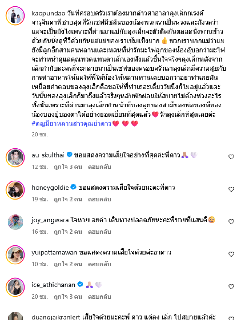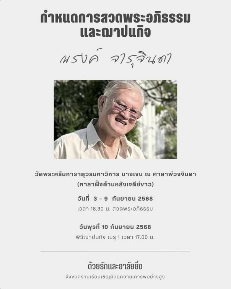 นับว่าเป็นที่เศร้าของครอบครัวเเละแฟนๆเป็นอย่างมากหลังสูญเสียผู้กำกับชื่อดัง เล็ก ณรงค์ จารุจินดา โดยเมื่อคืนที่ผ่านมา (3 ก.ย. 68) ที่ผ่านมา ในพิธีสวดพระอภิธรรมคืนแรก คนในวงการบันเทิงต่างเดินทางมาร่วมไว้อาลัยเเละส่งกำลังใจให้กับครอบครัวกันอย่างล้นหลาม