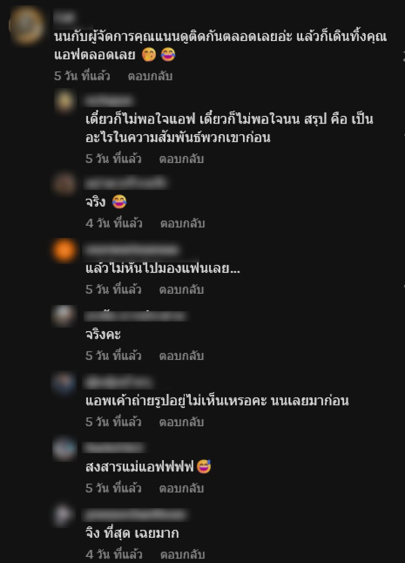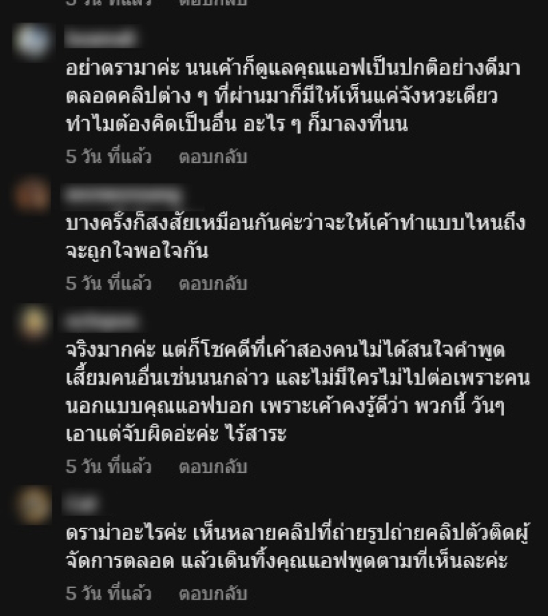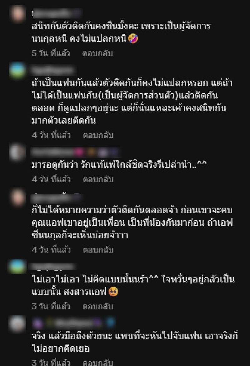 จากนั้นได้มีแฟนคลับได้เข้ามาคอมเมนต์อีกเสียงว่า โอ้ยยเทอมันเป็นแค่คลิปสั้นๆเนาะจะเอาไรในคสพเค้าคะ,แอฟเค้าถ่ายรูปอยู่ไม่เห็นเหรอคะ นนเลยมาก่อน,อย่าคิดไปด้านนั้นเลยค่า แนนก็เป็นคนที่น่ารักมากๆ คนนึง เขาเป็นเพื่อนสนิทของนุ่น ผู้จัดการนน เขาผูกพันกับครอบครัวนี้ค่ะ และอย่าพึ่งตัดสินแนนจากคลิปเดียวเลยขอร้อง