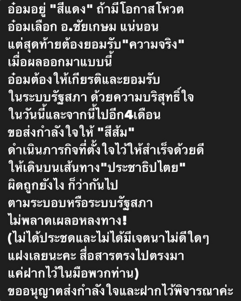 อ๋อมอยู่ สีแดง ถ้ามีโอกาสโหวต อ๋อมเลือก อ.ชัยเกษม แน่นอน แต่สุดท้ายต้องยอมรับความจริง เมื่อผลออกมาแบบนี้ อ๋อมต้องให้เกียรติและยอมรับในระบบรัฐสภา ด้วยความบริสุทธิ์ใจ ในวันนี้และจากนี้ไปอีก 4 เดือน ขอส่งกำลังใจให้ สีส้ม