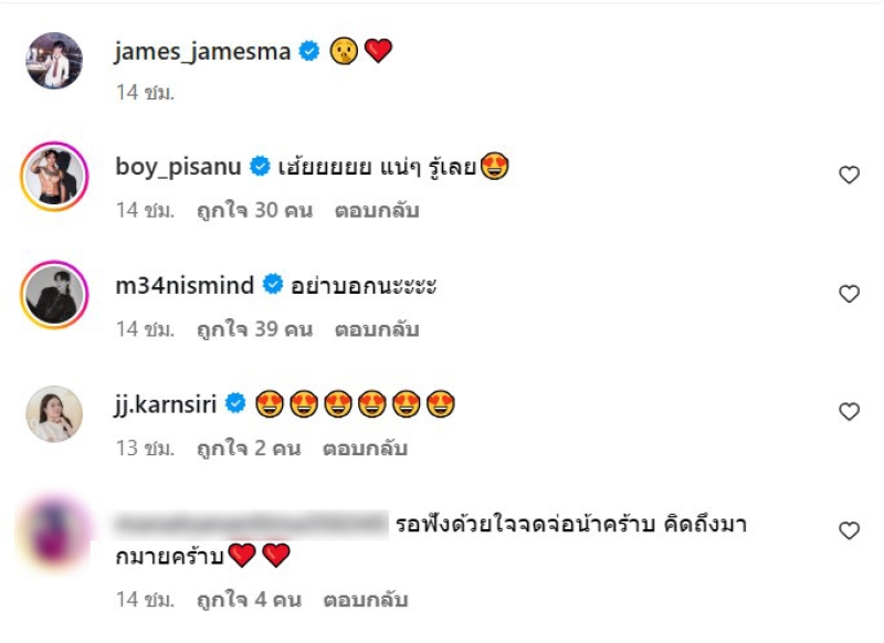 งานนี้ เพื่อนๆในวงการ และแฟนคลับ ต่างพาดีใจยกใหญ่ไปแล้ว และมีบางคนก็คิดว่าจะประกาศแต่งงานหรือเปล่านั้นเอง อย่างก็ตาม รอทางหนุ่มเจมส์ ออกมาพูดเองดีกว่าว่าจะรข่าวดีอะไร