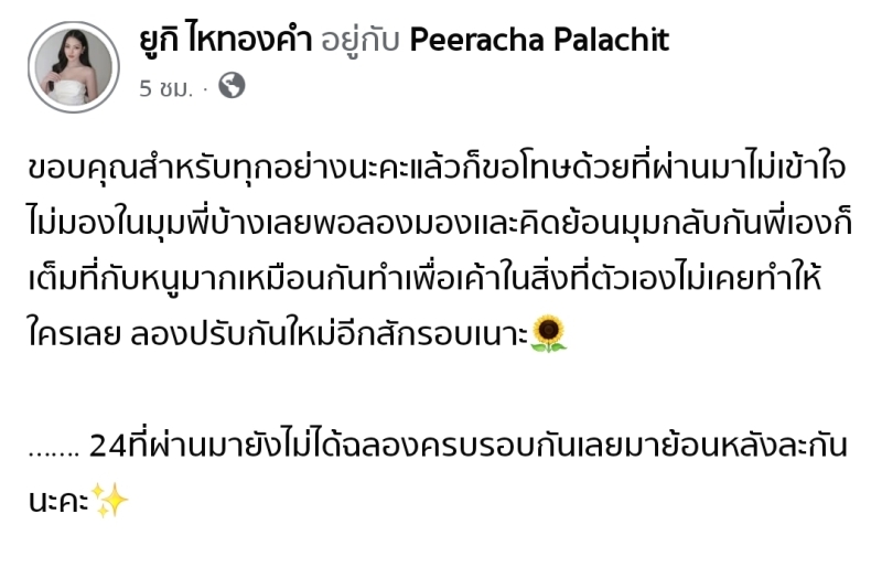 ล่าสุด ยูกิได้โพสต์ภาพคู่สุดหวานกับหนุ่มพีพี พร้อมข้อความขอโทษและขอบคุณที่อีกฝ่ายพยายามเต็มที่มาตลอด พร้อมเผยว่า ลองปรับกันใหม่อีกสักรอบเนาะ… 24 ที่ผ่านมายังไม่ได้ฉลองครบรอบ มาย้อนหลังละกันนะคะ