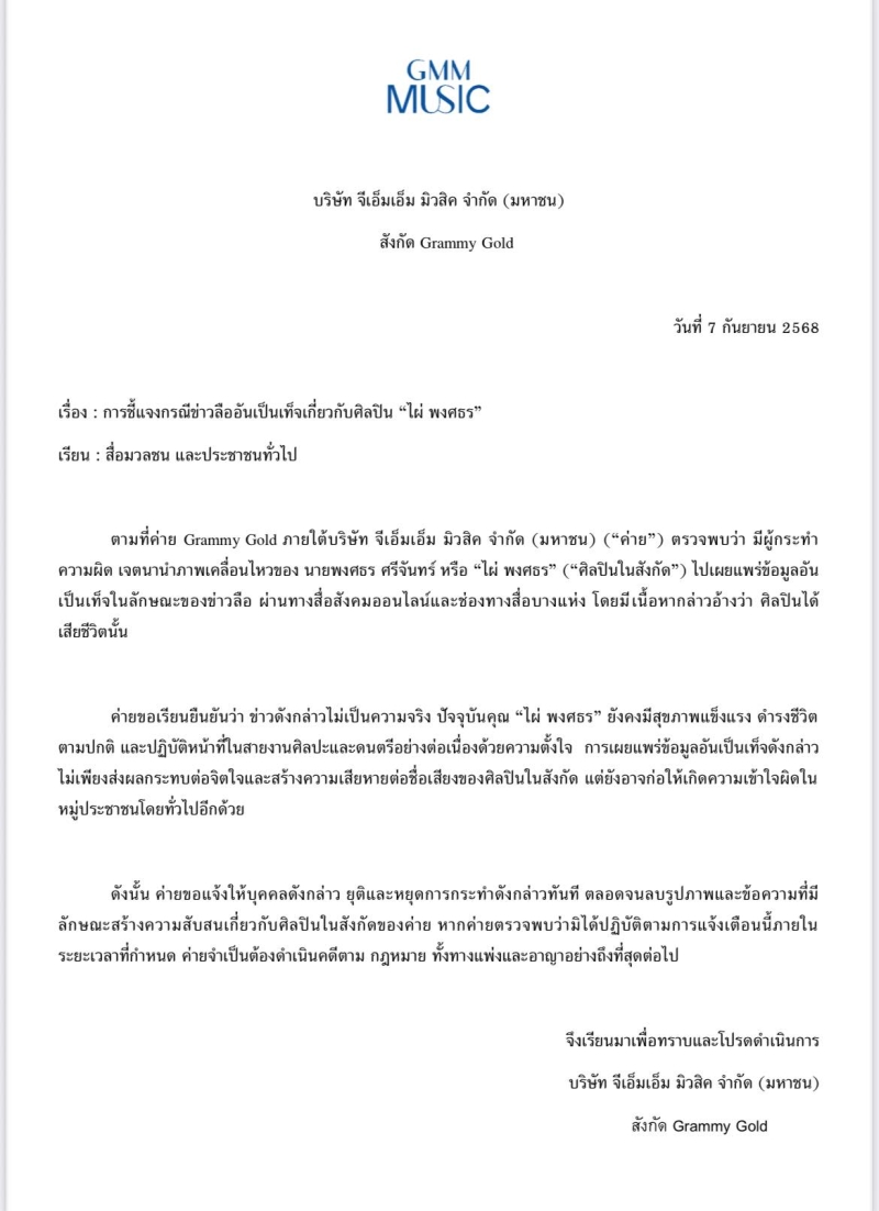 นายพงศธร ศรีจันทร์ หรือ ไผ่ พงศธร (ศิลปินในสังกัด) ไปเผยแพร่ข้อมูลอันเป็นเท็จในลักษณะของข่าวลือ ผ่านทางสื่อสังคมออนไลน์และช่องทางสื่อบางแห่ง โดยมีเนื้อหากล่าวอ้างว่า ศิลปินได้เสียชีวิตนั้น ค่ายขอเรียนยืนยันว่า ข่าวดังกล่าวไม่เป็นความจริง ปัจจุบันคุณ ไผ่ พงศธร ยังคงมีสุขภาพแข็งแรง ดำรงชีวิตตามปกติ