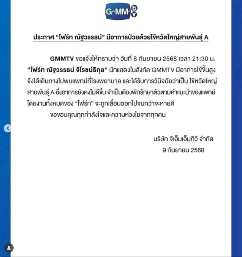 ทำเอาแฟนๆต่างเป็นห่วงกันอย่างมากเมื่อล่าสุดพระเอกหนุ่มสุดฮอต โฟร์ท ณัฐวรรธน์ จิโรชน์ธิกุล ได้แอดมิทเข้าโรงพยาบาลด่วน หังตรวจพบว่าเป็นไข้หวัดใหญ่สายพันธุ์ A โดยทางด้าน ค่าย GMMTV ได้ออกประกาศแจ้งอย่างเป็นทางการเมื่อวันที่ 8 กันยายน 2568 เวลา 21.30 น. ว่า