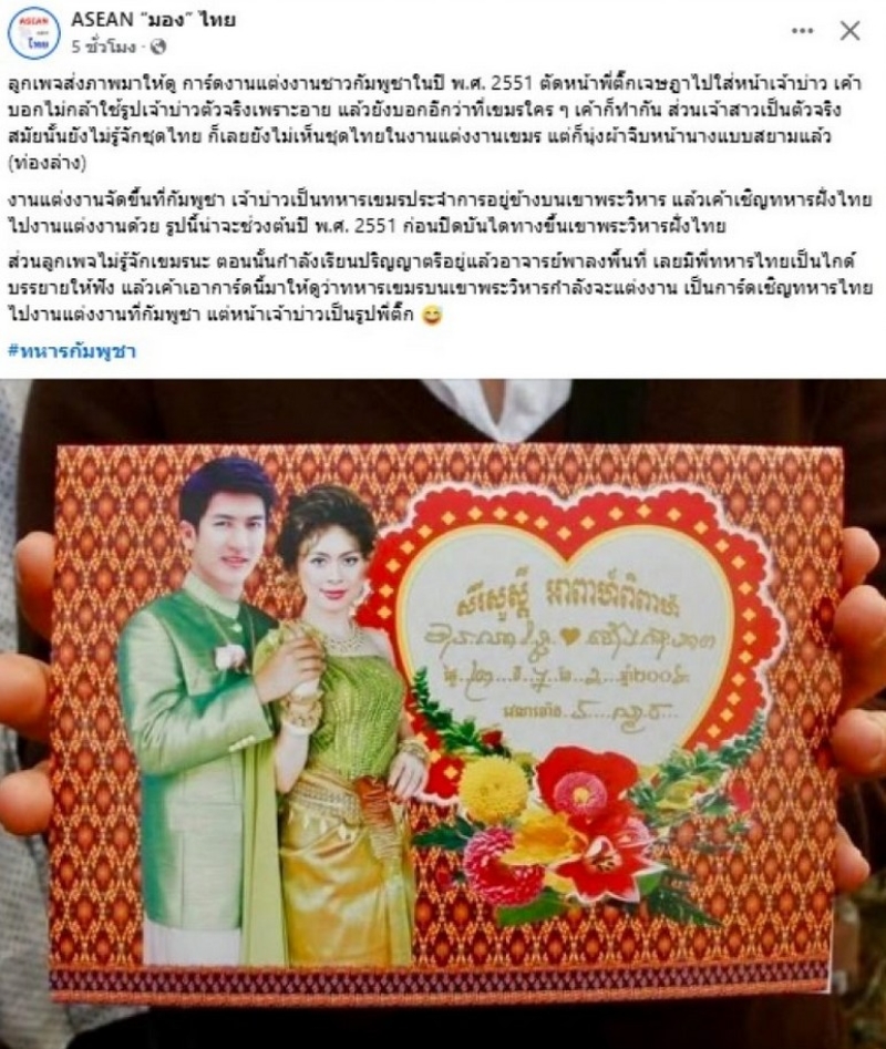 ส่วนลูกเพจไม่รู้จักเขมรนะ ตอนนั้นกำลังเรียนปริญญาตรีอยู่เเล้วอาจารย์พาลงพื้นที่ เลยมีพี่ทหารไทยเป็นไกด์บรรยายให้ฟัง เเล้วเค้าเอาการ์ดมาให้ดูว่าทหารเขมรบนเขาพระวิหารกำลังจะแต่งงาน เป็นการ์ดเชิญทหารไทยไปงานแต่งที่กัมพูชา แต่หน้าเจ้าบ่าวเป็นรูปพี่ตั๊ก