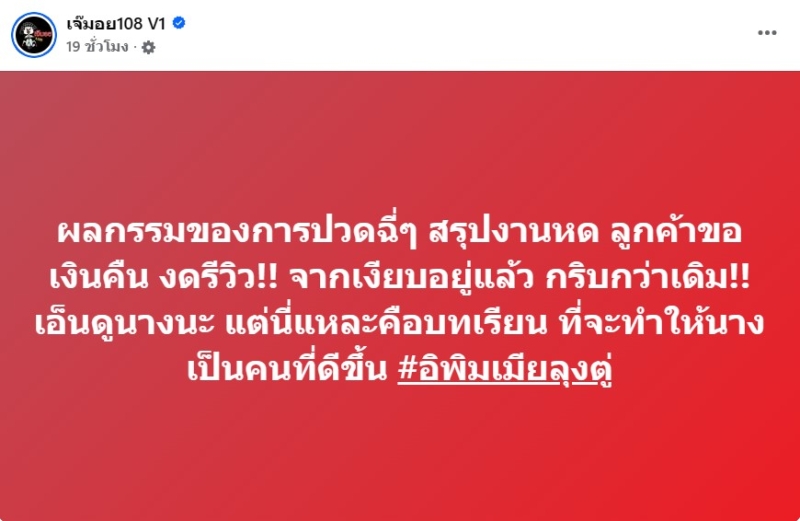 เรียกได้ว่า มีเรื่องราวมาให้แฟนๆต้องเมาท์อีกแล้ว สำหรับเพจดัง อย่าง เจ๊มอย108 V1 ที่ล่าสุดได้ออกมาเมาท์เรื่องราวดาราสาวคนหนึ่ง ที่ตอนนี้งานกำลังหดเพราะผลมาจากพฤตอกรรมของตัวเอง โดยได้เผยว่า ผลกรรมของการปวดฉี่ๆ สรุปงานหด ลูกค้าขอเงินคืน งดรีวิว!! จากเงียบอยู่แล้ว กริบกว่าเดิม!! เอ็นดูนางนะ แต่นี่แหละคือบทเรียน ที่จะทำให้นางเป็นคนที่ดีขึ้น #อิพิมเมียลุงตู่