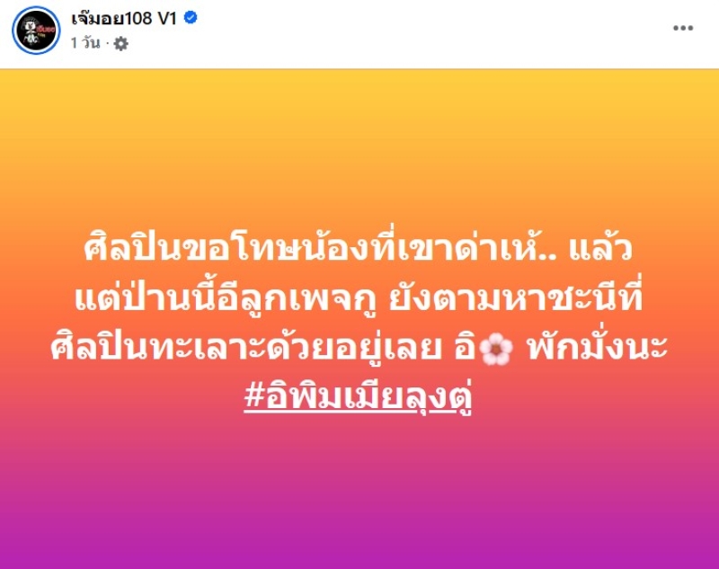 ล่าสุด ทาง เจ๊มอย108 V1 ได้ออกมาเผยว่า ศิลปินขอโทษน้องที่เขาด่าเห้.. แล้ว แต่ป่านนี้อีลูกเพจกู ยังตามหาชะนีที่ศิลปินทะเลาะด้วยอยู่เลย อิ(อิโมจิดอกไม้) พักมั่งนะ #อิพิมเมียลุงตู่