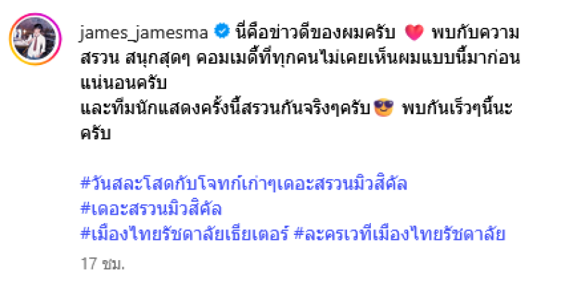 ล่าสุด เจมส์ มาร์ ได้ออกมาโพสตเฉลยข่าวดีว่า นี่คือข่าวดีของผมครับ พบกับความสรวน สนุกสุดๆ คอมเมดี้ที่ทุกคนไม่เคยเห็นผมแบบนี้มาก่อนแน่นอนครับ และทีมนักแสดงครั้งนี้สรวนกันจริงๆครับ พบกันเร็วๆนี้นะครับ