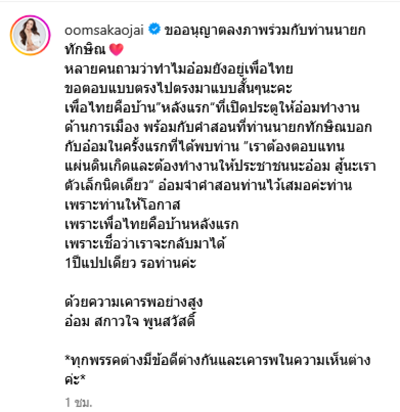 หลายคนถามว่าทำไมอ๋อมยังอยู่เพื่อไทย ขอตอบแบบตรงไปตรงมาแบบสั้นๆนะคะ เพื่อไทยคือบ้าน”หลังแรก“ที่เปิดประตูให้อ๋อมทำงานด้านการเมือง พร้อมกับคำสอนที่ท่านนายกทักษิณบอกกับอ๋อมในครั้งแรกที่ได้พบท่าน เราต้องตอบแทนแผ่นดินเกิดและต้องทำงานให้ประชาชนนะอ๋อม สู้นะเรา ตัวเล็กนิดเดียว