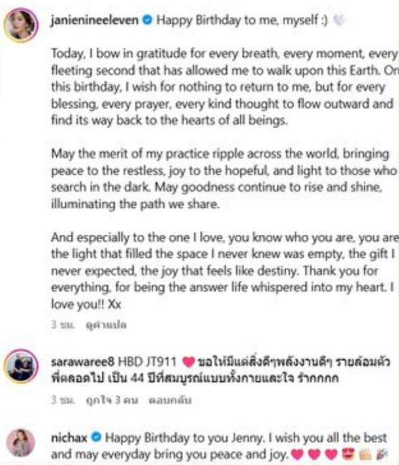 โดย ระบุว่า Happy Birthday to me, myself Today, I bow in gratitude for every breath, every moment, every fleeting second that has allowed me to walk upon this Earth. On this birthday, I wish for nothing to return to me, but for every blessing, every prayer, every kind thought to flow outward and find its way back to the hearts of all beings. May the merit of my practice ripple across the world, bringing peace to the restless, joy to the hopeful, and light to those who search in the dark. May goodness continue to rise and shine, illuminating the path we share. And especially to the one I love, you know who you are, you are the light that filled the space I never knew was empty, the gift I never expected, the joy that feels like destiny. Thank you for everything, for being the answer life whispered into my heart. I love you!! Xx