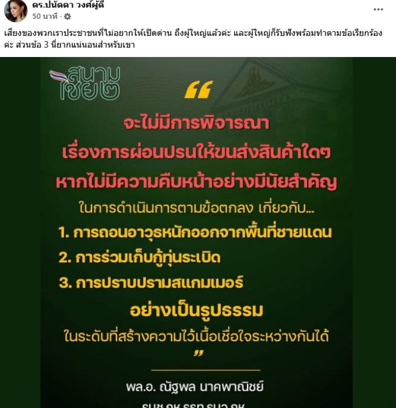 โดย บุ๋ม ปนัดดา ได้ออกมาโพสต์ข้อความระบุว่า เสียงของพวกเราประชาชนที่ไม่อยากให้เปิดด่าน ถึงผู้ใหญ่แล้วค่ะ และผู้ใหญ่ก็รับฟังพร้อมทำตามข้อเรียกร้องค่ะ ส่วนข้อ 3 นี่ยากแน่นอนสำหรับเขา