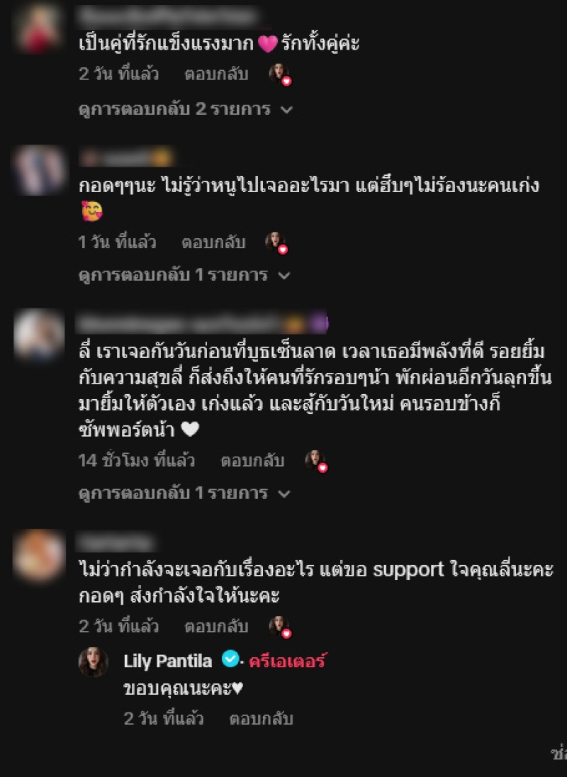 ทั้งนี้ยังเผยข้อความว่า เม้ในวันที่เหนื่อยที่สุด พี่ชินจะอยู่ตรงนั้นเสมอ เป็นที่ปรึกษา เวลาเจอปัญหา เป็นเซฟโซน เเละ เป็นผู้รับฟังทีดี นี่สินะที่เค้าพูดกันว่า การมีคู่ชีวิตที่ดี จะทำให้ชีวิตเราดีขึ้น @chinchinawut #ลิลลี่ชิน #lilypantila #chinchinawu