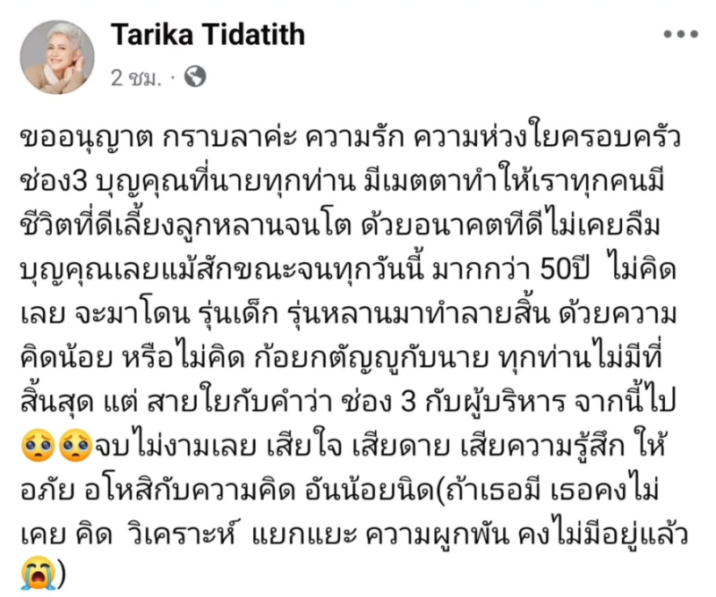 แม่ก้อยเขียนว่า มากกว่า 50 ปี ไม่คิดเลยจะมาโดนรุ่นเด็ก รุ่นหลานทำลาย ด้วยความคิดน้อย หรือไม่คิด ให้อภัย อโหสิกรรมกับความคิดอันน้อยนิด พร้อมทิ้งท้ายว่า แม้กตัญญูและเคารพผู้ใหญ่เสมอ แต่ความสัมพันธ์กับช่อง 3 และผู้บริหาร ได้จบลงแบบไม่งามเลย