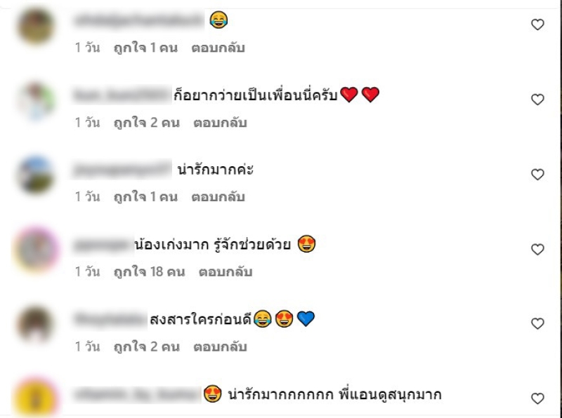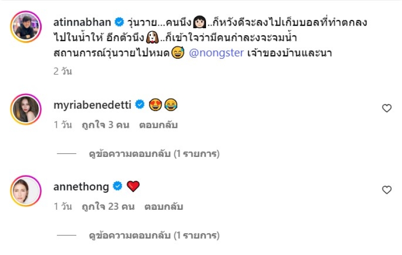ท่ามกลาง เพื่อนๆในวงการและชาวเน็ตเข้ามาคอมเมนต์กันจำนวนมาก เช่น ก็อยากว่ายเป็นเพื่อนนี่ครับ,น้องเก่งมาก รู้จักช่วยด้วย,สงสารใครก่อนดี, น่ารักมากกกกกก พี่แอนดูสนุกมาก,เอ็นดูแท้นางเอกอัมดับหนึ่ง,อยู่ในสระบัวน่ารักจังเลย เป็นต้น