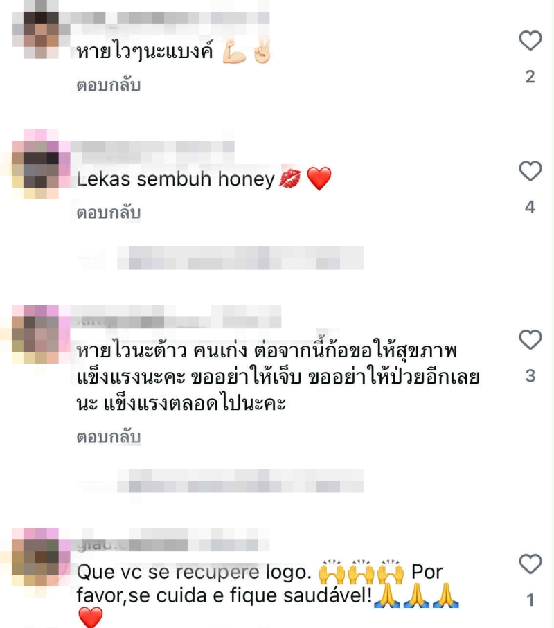 ทันทีที่ข่าวถูกเผยแพร่ออกไป เหล่าแฟนๆ และเพื่อนนักแสดงต่างส่งกำลังใจให้ไม่ขาดสาย หลายคนภาวนาให้ แบงค์ กลับมาแข็งแรงโดยเร็ว และพร้อมคืนจอสร้างผลงานให้แฟนๆ ได้หายคิดถึงอีกครั้ง