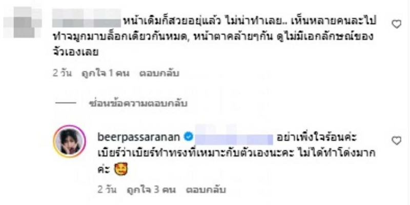 แม้ข้อความดังกล่าวจะฟังดูแรง แต่สาวเบียร์ ก็เลือกใช้วิธีตอบกลับอย่างสุภาพ เธอ ยืนยันว่า ตัดสินใจเลือกทรงที่เข้ากับโครงหน้า ไม่ได้เน้นให้ดูโด่งจนเกินไป ทุกอย่างทำด้วยความตั้งใจให้เหมาะสมกับตัวเองมากที่สุด