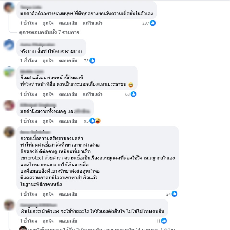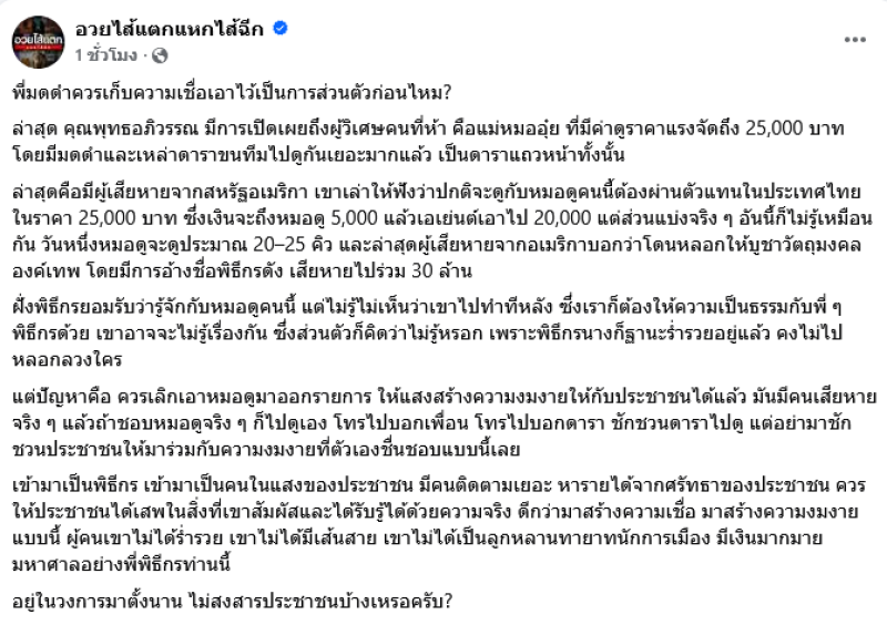 เข้ามาเป็นพิธีกร เข้ามาเป็นคนในแสงของประชาชน มีคนติดตามเยอะ หารายได้จากศรัทธาของประชาชน ควรให้ประชาชนได้เสพในสิ่งที่เขาสัมผัสและได้รับรู้ได้ด้วยความจริง ดีกว่ามาสร้างความเชื่อ มาสร้างความงมงายแบบนี้ ผู้คนเขาไม่ได้ร่ำรวย เขาไม่ได้มีเส้นสาย เขาไม่ได้เป็นลูกหลานทายาทนักการเมือง มีเงินมากมายมหาศาลอย่างพี่พิธีกรท่านนี้ อยู่ในวงการมาตั้งนาน ไม่สงสารประชาชนบ้างเหรอครับ