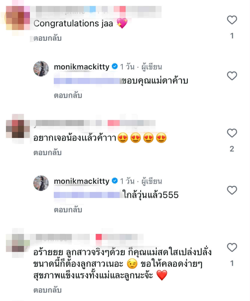 เพื่อนร่วมวงการหลายคนไม่พลาดเข้ามาร่วมอวยพร ทั้งขอให้สุขภาพของ คุณแม่ แข็งแรง และให้ เจ้าตัวน้อย คลอดออกมาอย่างปลอดภัยสมบูรณ์