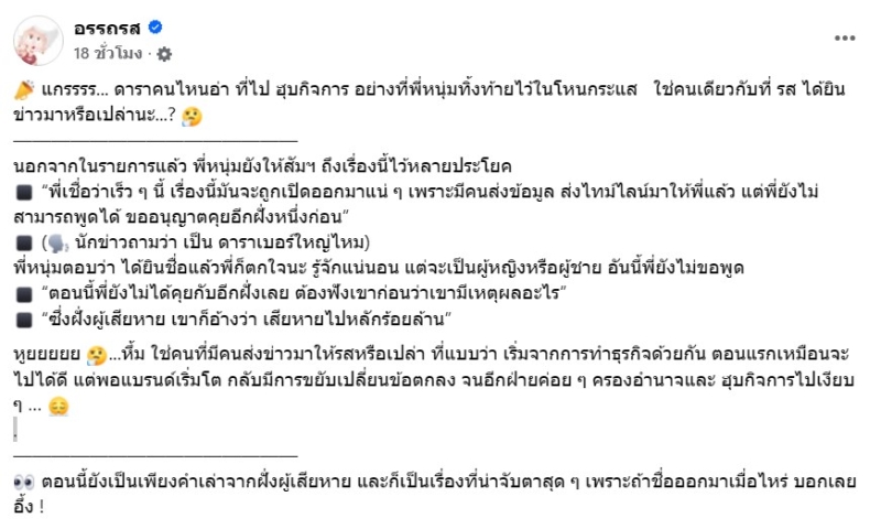 เรียดได้ว่า มีแต่คำใบ้มาให้แฟนๆได้ติดตามกัน เมื่อล่าสุด ทางเพจดัง อย่าง อรรถรส ได้ออกมาเปิดประเด็นครั้งใหญ่ โดยเผยว่า ดาราคนไหนอ่า ที่ไป ฮุบกิจการ อย่างที่พี่หนุ่มทิ้งท้ายไว้ในโหนกระแส ใช่คนเดียวกับที่ รส ได้ยินข่าวมาหรือเปล่านะ