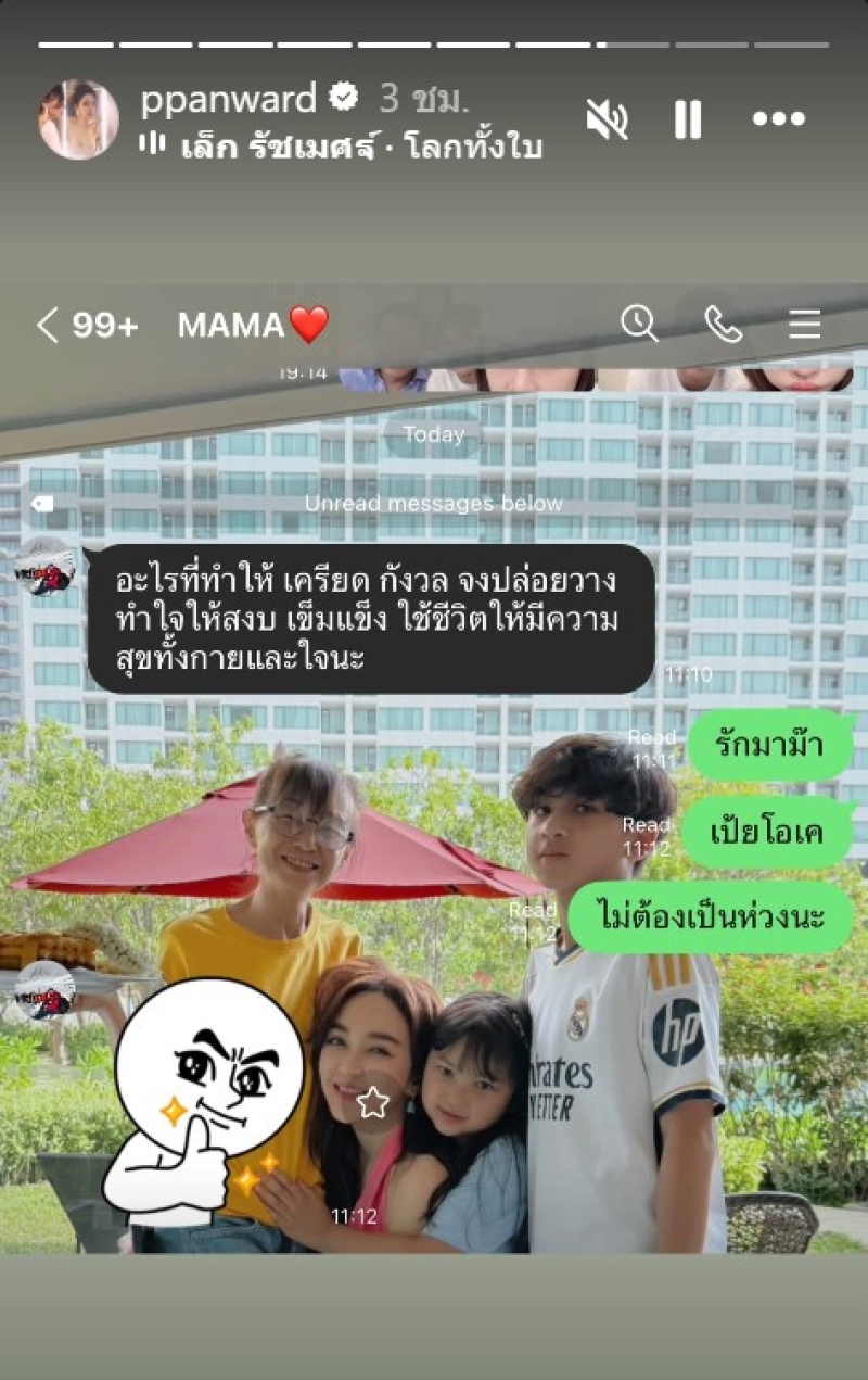 ล่าสุด เป้ย ได้เคลื่อนไหวอีกครั้ง โดยโพสต์สตอรี่เป็นแชทไลน์ที่คุยกับคุณแม่ โดยคุณแม่ของเป้ยได้ส่งไลน์มาให้กำลังใจบอกว่า “อะไรที่ทำให้เครียด กังวล จงปล่อยวางทำใจให้สงบ เข้มแข็ง ใช้ชีวิตให้มีความสุขทั้งกายและใจนะ” ซึ่งเป้ยได้ตอบแม่ว่า “รักม่าม๊า เป้ยโอเค ไม่ต้องเป็นห่วงนะ”