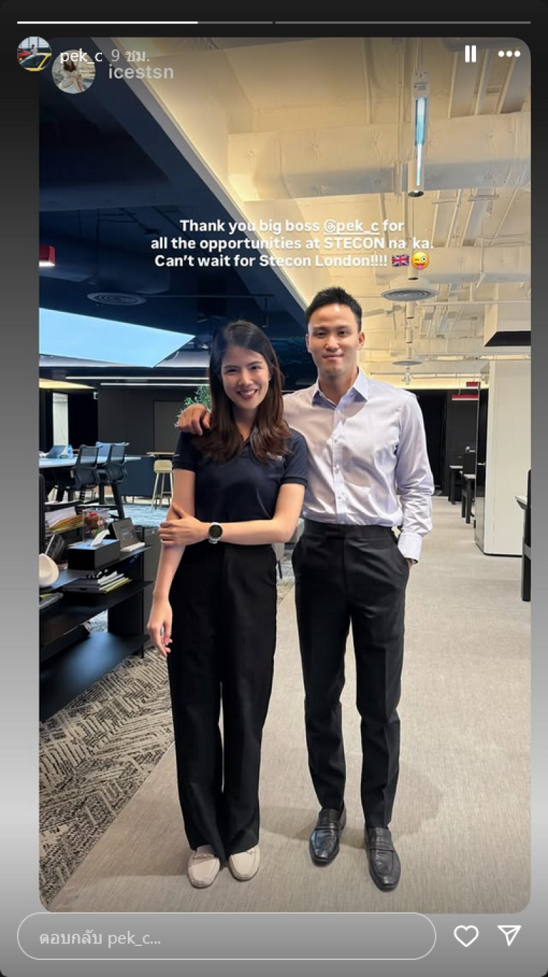 โดยสาวดังกล่าวคือ ไอซ์ น่าจะเป็นเพื่อนร่วมงาน ในฐานะลูกน้อง และได้โพสต์ขอบคุณ เป๊ก ว่า Thank you big boss @pek_c for all the opportunities at STECON na ka. Can't wait for Stecon London!!!!! ( ขอบคุณบอสใหญ่ @pek_c สำหรับโอกาสดีๆ มากมายที่ STECON นะคะ รอ Stecon London ไม่ไหวแล้ว!!!!!)