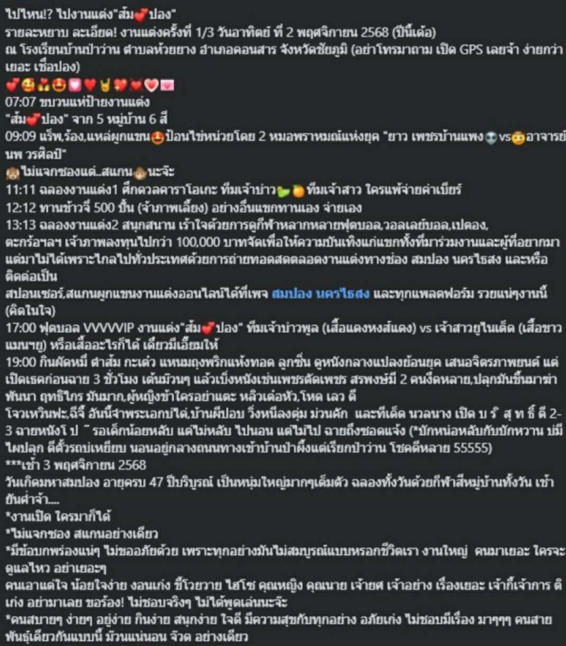เรียกได้ว่า บรรยากาศงานวิวาห์ของ สมปอง นครไธสง กับ ส้ม กำลังถูกจับตามองอย่างมาก หลัง เจ้าตัว ออกมาเผยกำหนดจัดพิธีใน วันที่ 2 พฤศจิกายน 2568 ที่โรงเรียนบ้านป่าว่าน จังหวัดชัยภูมิ ผ่านเฟซบุ๊ก สมปอง นครไธสง