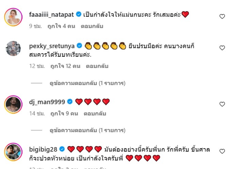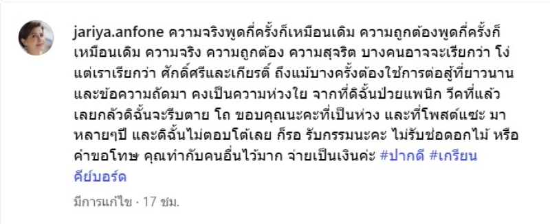เรียกได้ เป็นนักแสดงรุ่นใหญ่ อย่าง นก จริยา ที่ล่าสุด สุดทนแล้วพร้อมขึ้นศาลโดยได้ออกมาเผยว่า ความจริงพูดกี่ครั้งก็เหมือนเดิม ความถูกต้องพูดกี่ครั้งก็เหมือนเดิม ความจริง ความถูกต้อง ความสุจริต บางคนอาจจะเรียกว่า โง่ แต่เราเรียกว่า ศักดิ์ศรีและเกียรติ์ ถึงแม้บางครั้งต้องใช้การต่อสู้ที่ยาวนาน และข้อความถัดมา คงเป็นความห่วงใย จากที่ดิฉั้นป่วยแพนิก วีคที่แล้ว เลยกลัวดิฉั้นจะรีบตาย โถ ขอบคุณนะคะที่เป็นห่วง และที่โพสต์แซะ มาหลายๆปี และดิฉั้นไม่ตอบโต้เลย ก็รอ รับกรรมนะคะ ไม่รับช่อดอกไม้ หรือคำขอโทษ คุณทำกับคนอื่นไว้มาก จ่ายเป็นเงินค่ะ #ปากดี #เกรียนคีย์บอร์ด