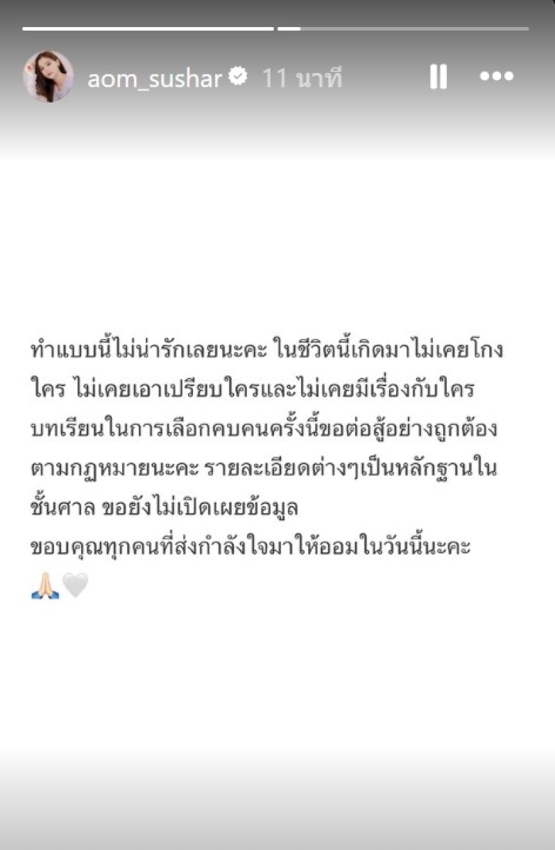 และทางออมนั้น ยังได้โพสต์สตอรี่ไอจีว่า ทําแบบนี้ไม่น่ารักเลยนะคะ ในชีวิตนี้เกิดมาไม่เคยโกง ใคร ไม่เคยเอาเปรียบใครและไม่เคยมีเรื่องกับใคร บทเรียนในการเลือกคบคนครั้งนี้ขอต่อสู้อย่างถูกต้อง ตามกฎหมายนะคะ รายละเอียดต่างๆเป็นหลักฐานใน ชั้นศาล ขอยังไม่เปิดเผยข้อมูล ขอบคุณทุกคนที่ส่งกําลังใจมาให้ออมในวันนี้นะคะ