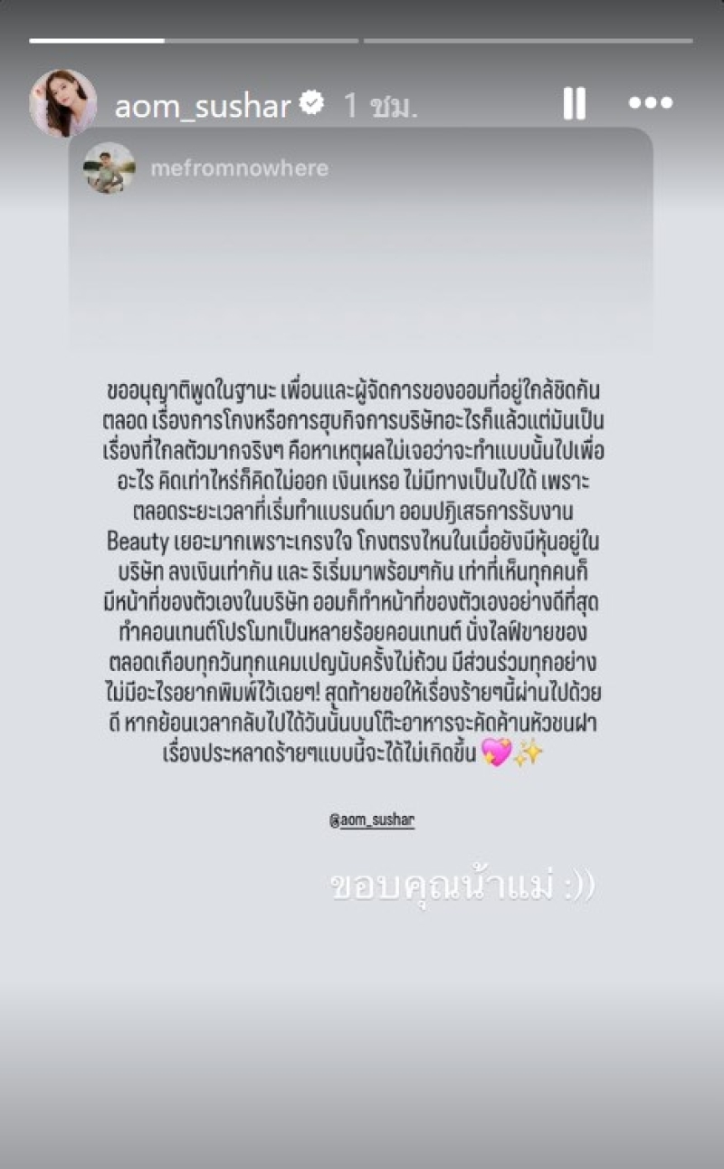 ล่าสุด ทาง ผู้จัดการ ของ ออม สุชาร์ ได้โพสต์ข้อความร่ายยาว ยืนยันว่าเรื่องการโกงหรือฮุบกิจการนั้นเป็นเรื่องที่ไกลตัวนักแสดงสาวมาก โดยระบุว่า “ขออนุญาติพูดในฐานะเพื่อนและผู้จัดการของออมที่อยู่ใกล้ชิดกันตลอด เรื่องการโกงหรือการฮุบกิจการบริษัทอะไรก็แล้วแต่มันเป็น เรื่องที่ไกลตัวมากจริง ๆ คือหาเหตุผลไม่เจอว่าจะทําแบบนั้นไปเพื่ออะไร คิดเท่าไหร่ก็คิดไม่ออก เงินเหรอ ไม่มีทางเป็นไปได้ เพราะตลอดระยะเวลาที่เริ่มทําแบรนด์มา ออมปฏิเสธการรับงาน Beauty เยอะมาก เพราะเกรงใจ โกงตรงไหนในเมื่อยังมีหุ้นอยู่ในบริษัท ลงเงินเท่ากัน และ ริเริ่มมาพร้อม ๆ กันเท่าที่เห็น ทุกคนก็มีหน้าที่ของตัวเองในบริษัท