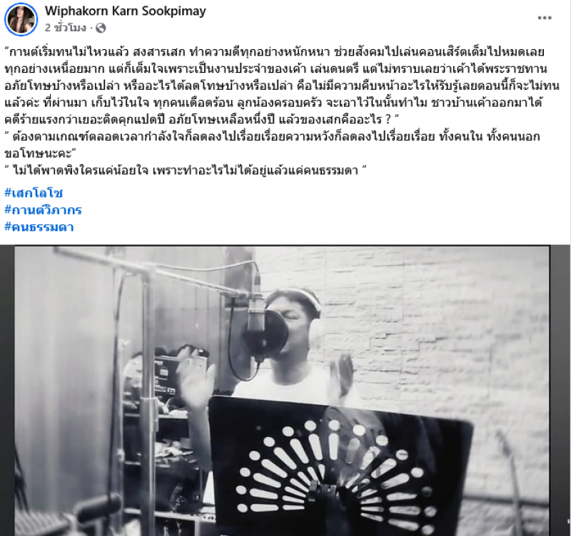 แต่ก็เต็มใจเพราะเป็นงานประจำของเค้า เล่นดนตรี แต่ไม่ทราบเลยว่าเค้าได้พระราชทานอภัยโทษบ้างหรือเปล่า หรืออะไรได้ลดโทษบ้างหรือเปล่า คือไม่มีความคืบหน้าอะไรให้รับรู้เลยตอนนี้ก็จะไม่ทนแล้วค่ะ ที่ผ่านมา เก็บไว้ในใจ ทุกคนเดือดร้อน ลูกน้องครอบครัว จะเอาไว้ในนั้นทำไม