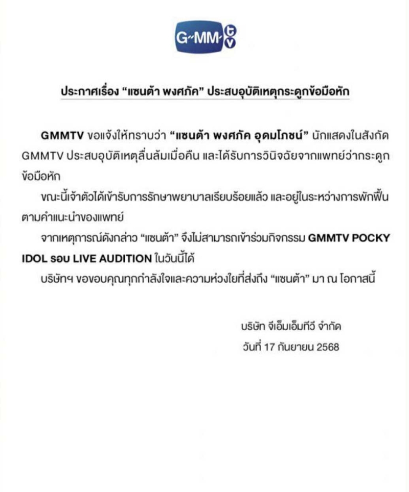 เรียกได้ว่า สร้างความตกใจให้แฟนๆ ไม่น้อย สำหรับข่าวของ แซนต้า พงศภัค อุดมโภชน์ นักแสดงหนุ่มในสังกัด GMMTV ล่าสุด ต้นสังกัด ออกมาเปิดเผยว่า เจ้าตัว ประสบอุบัติเหตุลื่นล้มเมื่อคืนวันที่ 16 กันยายน 2568