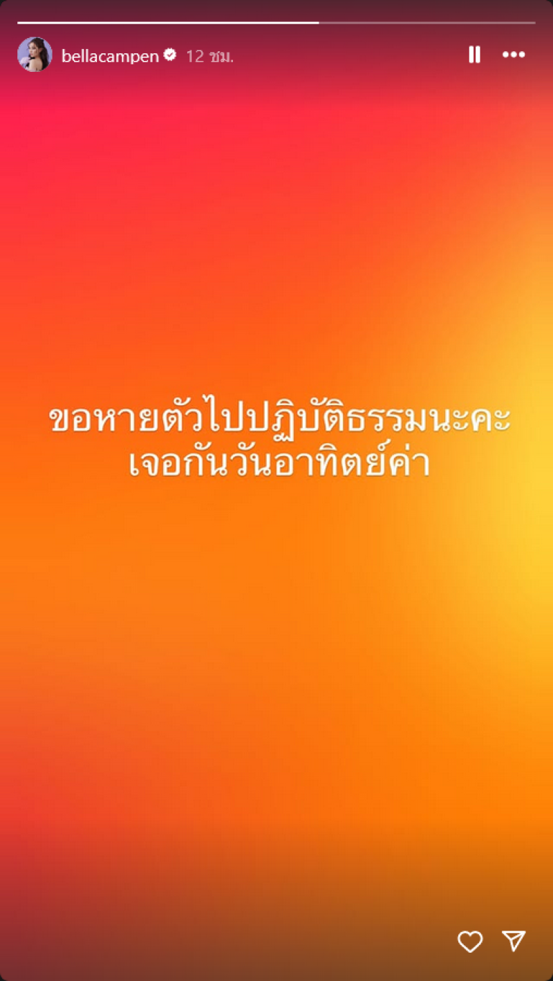 ซึ่งจะขอหายตัวไปจากโซเชียลสักพัก เนื่องจาก เบลล่า ไปเข้าวัดปฎิบัติธรรม โดยเเจ้งว่า ขอหายตัวไปปฏิบัติธรรมนะคะ เจอกันวันอาทิตย์ค่า