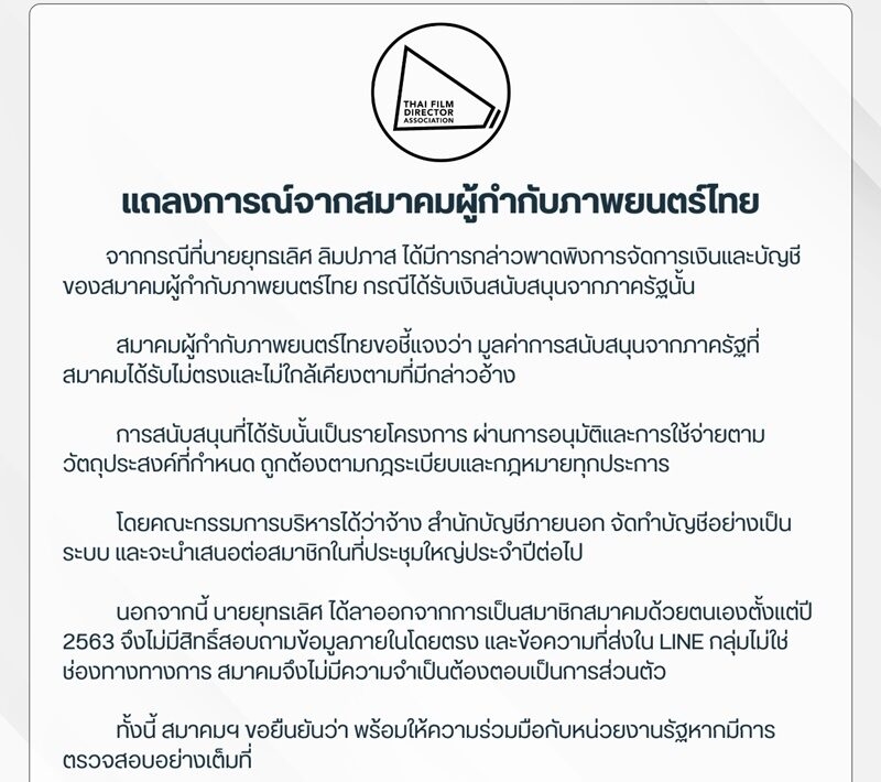 โดยสมาคมจะให้ข้อมูลผ่าน ช่องทางที่กำหนดสำหรับสมาชิกปัจจุบัน หรือผ่านหน่วยงานรัฐที่มีอำนาจตรวจสอบ หากมีคำสั่งหรือการร้องขออย่างเป็นทางการ สมาคมผู้กำกับภาพยนตร์ไทยยืนยันความพร้อมให้ความร่วมมือกับหน่วยงานที่เกี่ยวข้องทุกประการ เพื่อสร้างความเชื่อมั่นและคงความโปร่งใสในกระบวนการทำงานของสมาคม ประกาศ ณ วันที่ 17 กันยายน 2568 คณะกรรมการบริหารสมาคมผู้กำกับภาพยนตร์ไทย
