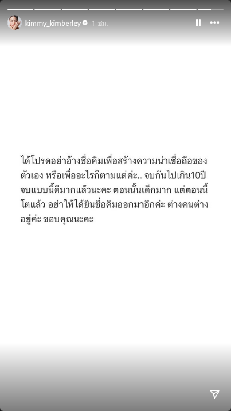 ล่าสุด คิมเบอร์ลี่ ได้ออกมาโต้กลับสตอรี่ไอจีทันทีว่า ได้โปรดอย่าอ้างชื่อคิมเพื่อสร้างความน่าเชื่อถือของตัวเอง หรือเพื่ออะไรก็ตามแต่ค่ะ จบกันไปเกิน 10 ปี จบแบบนี้ดีมากแล้วนะคะ ตอนนั้นเด็กมาก แต่ตอนนี้โตแล้ว อย่าให้ได้ยินชื่อคิมออกมาอีกค่ะ ต่างคนต่างอยู่ค่ะ ขอบคุณนะคะ