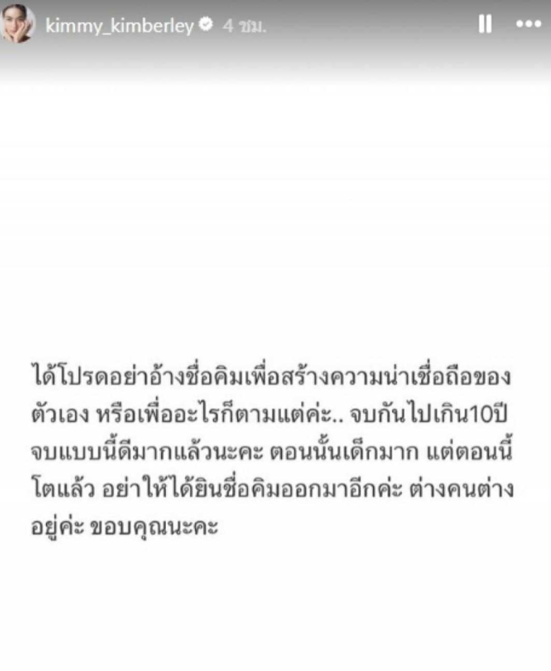 ต่อมา คิมเบอร์ลี่ ได้ออกมาชี้แจงผ่านอินสตาแกรม kimmy_kimberley โดยย้ำว่า ขอให้หยุดนำชื่อของเธอ ไปอ้างเพื่อผลประโยชน์ส่วนตัว พร้อมยืนยันว่า เรื่องราวในอดีตจบลงไปนานแล้ว และไม่ต้องการให้ถูกนำมากล่าวถึงอีกต่อไป