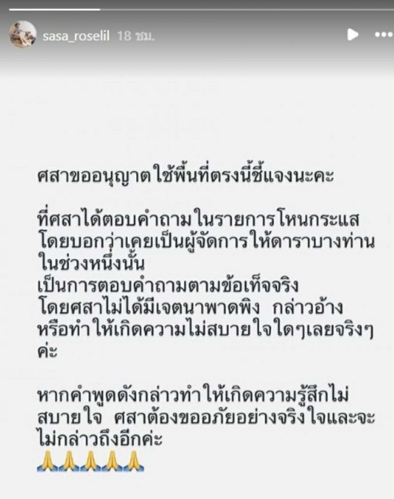 ล่าสุด ศสา ได้โพสต์ข้อความผ่านอินสตาแกรม sasa_roselil เพื่ออธิบายมุมมองของตนเอง ว่า การตอบคำถามในรายการ เป็นการเล่าตามข้อเท็จจริงที่เกิดขึ้นในช่วงหนึ่งของชีวิตการทำงาน และไม่ได้มีเจตนาจะสร้างความขัดแย้ง หรือ ทำให้ใครรู้สึกไม่สบายใจ