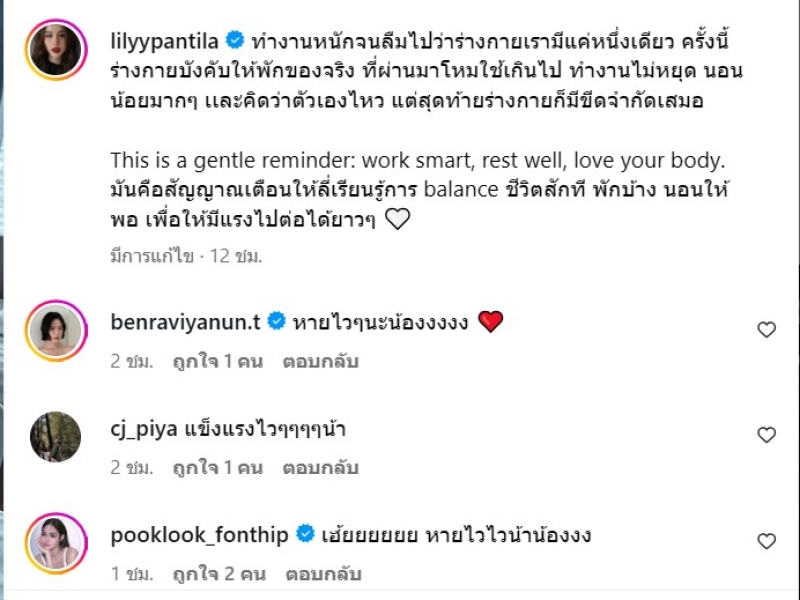 เรียกได้ว่า ทำเอาแฟนๆเป็นห่วงหนักมาก เมื่อล่าสุดทางดาราสาว อย่าง ลิลลี่ ภัณฑิลา ภรรยาของ ชิน ชินวุฒ ที่ได้เผยภาพเข้าโรงพยาบาล พร้อมได้เขียนข้อความ ว่า ทำงานหนักจนลืมไปว่าร่างกายเรามีแค่หนึ่งเดียว ครั้งนี้ร่างกายบังคับให้พักของจริง ที่ผ่านมาโหมใช้เกินไป ทำงานไม่หยุด นอนน้อยมากๆ เเละคิดว่าตัวเองไหว แต่สุดท้ายร่างกายก็มีขีดจำกัดเสมอ
