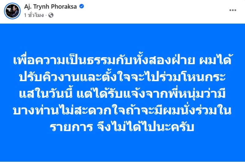 จากกรณีที่ก่อนหน้านั้น ทางอาจารย์ตฤณ ได้ออกมาโพสต์ผ่านfacebook Aj. Trynh Phoraksa ว่า เพื่อความเป็นธรรมกับทั้งสองฝ่าย ผมได้ปรับคิวงานและตั้งใจจะไปร่วมโหนกระแสในวันนี้ แต่ได้รับแจ้งจากพี่หนุ่มว่ามีบางท่านไม่สะดวกใจถ้าจะมีผมนั่งร่วมในรายการ จึงไม่ได้ไปนะครับ