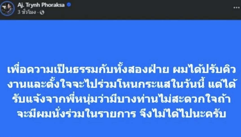 ไม่นานหลังจากนั้น ดร.ตฤณห์ ก็ไม่ปล่อยให้ความเงียบกินพื้นที่นาน เขา ได้โพสต์สั้นๆ ผ่านเฟซบุ๊ก Aj. Trynh Phoraksa ด้วยข้อความว่า ผมก็งอนเป็นเหมือนกัน ซึ่งสะท้อนชัด ถึงการโต้ตอบกลับไปยังอีกฝั่ง
