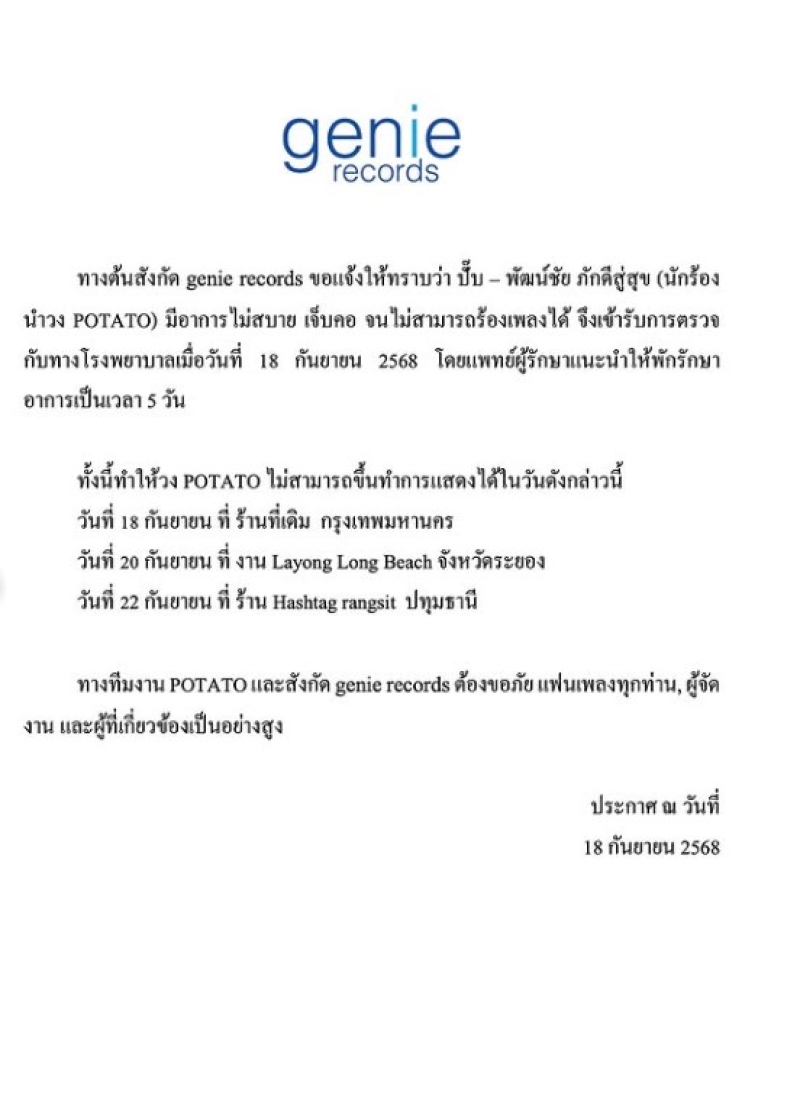 ทางต้นสังกัด genie records ขอแจ้งให้ทราบว่า ใบ – พัฒน์ชัย ภักดีสู่สุข (นักร้อง นําวง POTATO) มีอาการไม่สบาย เจ็บคอ จนไม่สามารถร้องเพลงได้ จึงเข้ารับการตรวจ กับทางโรงพยาบาลเมื่อวันที่ 18 กันยายน 2568 โดยแพทย์ผู้รักษาแนะนําให้พักรักษา อาการเป็นเวลา 5 วัน