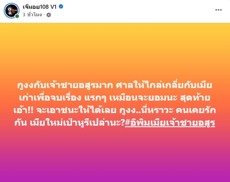 เรียกได้ว่า เป็นเรื่องราวที่ทำเอาชาวเน็ตต้องรีบเข้ามาคอมเมนต์กันจำนวนมาก เมื่อล่าสุด ทางเจ๊มอย108 V1 ได้ออกมาเปิดประเด็นว่า กูงงกับเจ้าชายอสูรมาก ศาลให้ไกล่เกลี่ยกับเมียเก่าเพื่อจบเรื่อง แรกๆ เหมือนจะยอมนะ สุดท้าย เอ้า!! จะเอาชนะให้ได้เลย กูงง..นี่หราวะ คนเคยรักกัน เมียใหม่เป่าหูรึเปล่านะ? #อิพิมเมียเจ้าชายอสูร