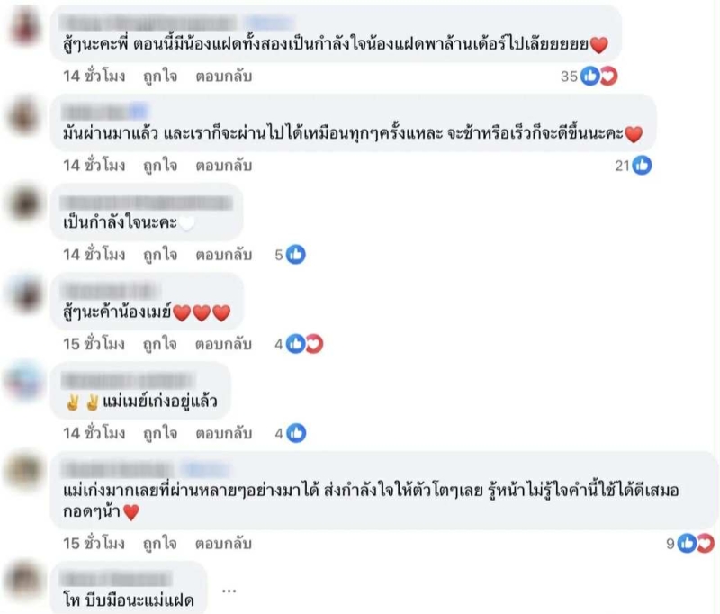 โพสต์ดังกล่าวทำให้ผู้ติดตามจำนวนมาก ออกมาส่งกำลังใจอย่างล้นหลาม หลายคนยกย่องความแข็งแกร่งของ เม ที่กล้าเล่าเรื่องราวอันเจ็บปวด และย้ำว่า ประสบการณ์ครั้งนี้ คือบทเรียนราคาแพง พร้อมอวยพรให้ เธอ มีพลังใจเดินหน้าต่อไปในเส้นทางใหม่ที่มั่นคงกว่าเดิม