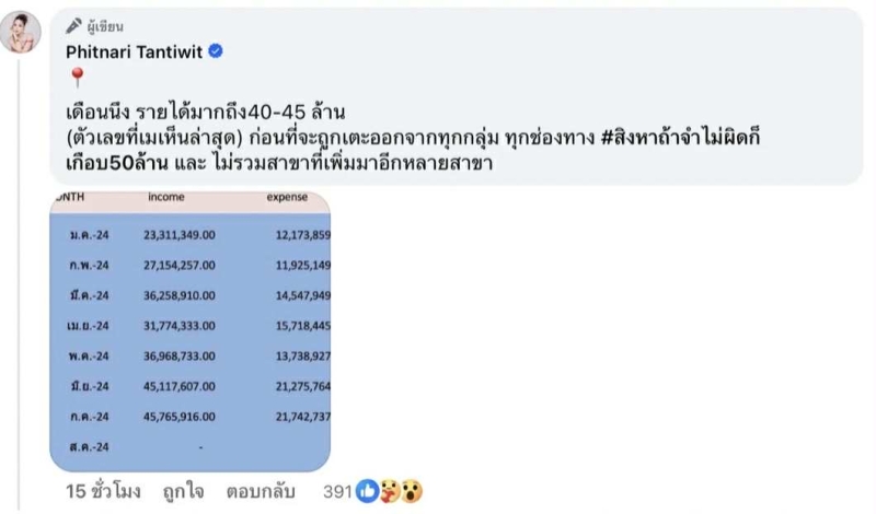 อีกทั้ง เม ยังเปิดเผยรายได้ของบริษัทที่ร่วมสร้างว่า ช่วงต้นปี 2567 ยอดขายต่อเดือนสูงถึง 40-45 ล้านบาท และในเดือนสิงหาคม แตะเกือบ 50 ล้าน ซึ่งถือเป็นรายได้ที่มากพอจะเปลี่ยนชีวิตคนได้ แต่เธอกลับต้องยืนมองจากข้างนอก ขณะที่ผู้ถือหุ้นแทนในปัจจุบัน ยังคงมีชื่อเสียง ใช้ชีวิตหรูหรา และได้รับผลประโยชน์ทั้งหมด