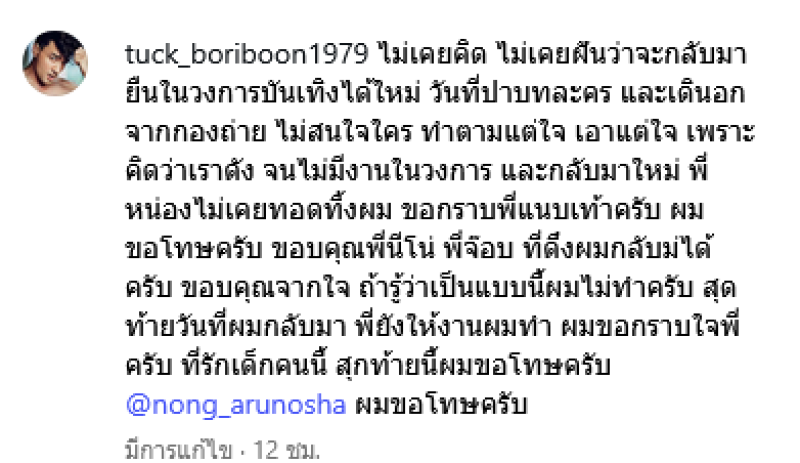 ไม่เคยคิด ไม่เคยฝันว่าจะกลับมายืนในวงการบันเทิงได้ใหม่ วันที่ปาบทละคร และเดินอกจากกองถ่าย ไม่สนใจใคร ทำตามแต่ใจ เอาแต่ใจ เพราะคิดว่าเราดัง จนไม่มีงานในวงการ และกลับมาใหม่ พี่หน่องไม่เคยทอดทิ้งผม ขอกราบพี่แนบเท้าครับ ผมขอโทษครับ